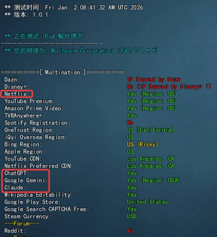 这类脚本用于检测服务器VPS IP是否可以观看Netflix、Disney+、TikTok、YouTube Premium、Gemini、ChatGPT等地区的限制内容。